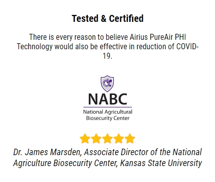 ※ Airius PureAir는 현재 코로나 바이러스 에 대해 테스트 중이며 , 검증 된 테스트 결과는 유사한 '외피'또는 단백질 재킷 바이러스 유형이 99 % 이상 감소