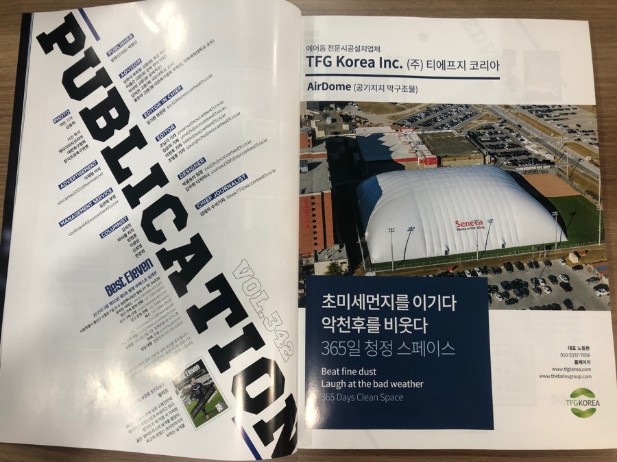 국내 축구 전문 매거진 베스트 일레븐 2021년 5월호 15p에 에어돔 전문 시공업체인 저희 (주)TFG KOREA 의 광고가 게재되었습니다.