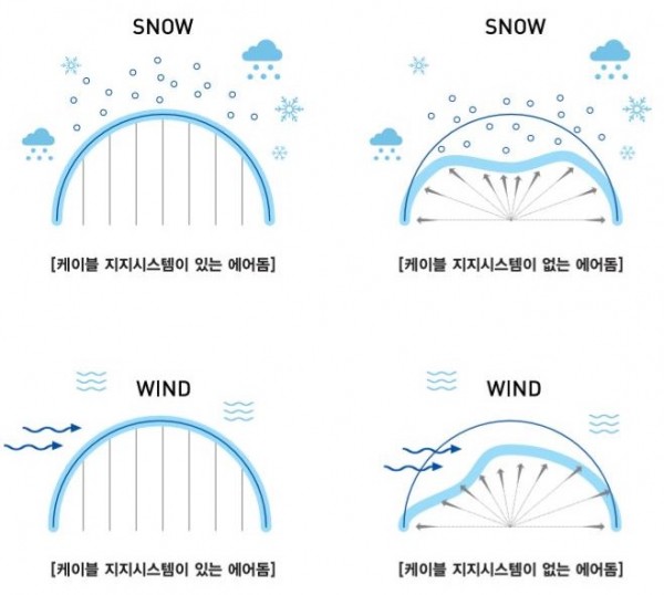 반면 케이블 지지 시스템이 없거나 혹은 기술이 낙후되어 있는 케이블 시스템이라면 돔의 구조는 단지 공기만 있는 풍선에 불과 하며 폭설에 의해 붕괴 될 가능성이 매우 큽니다.
